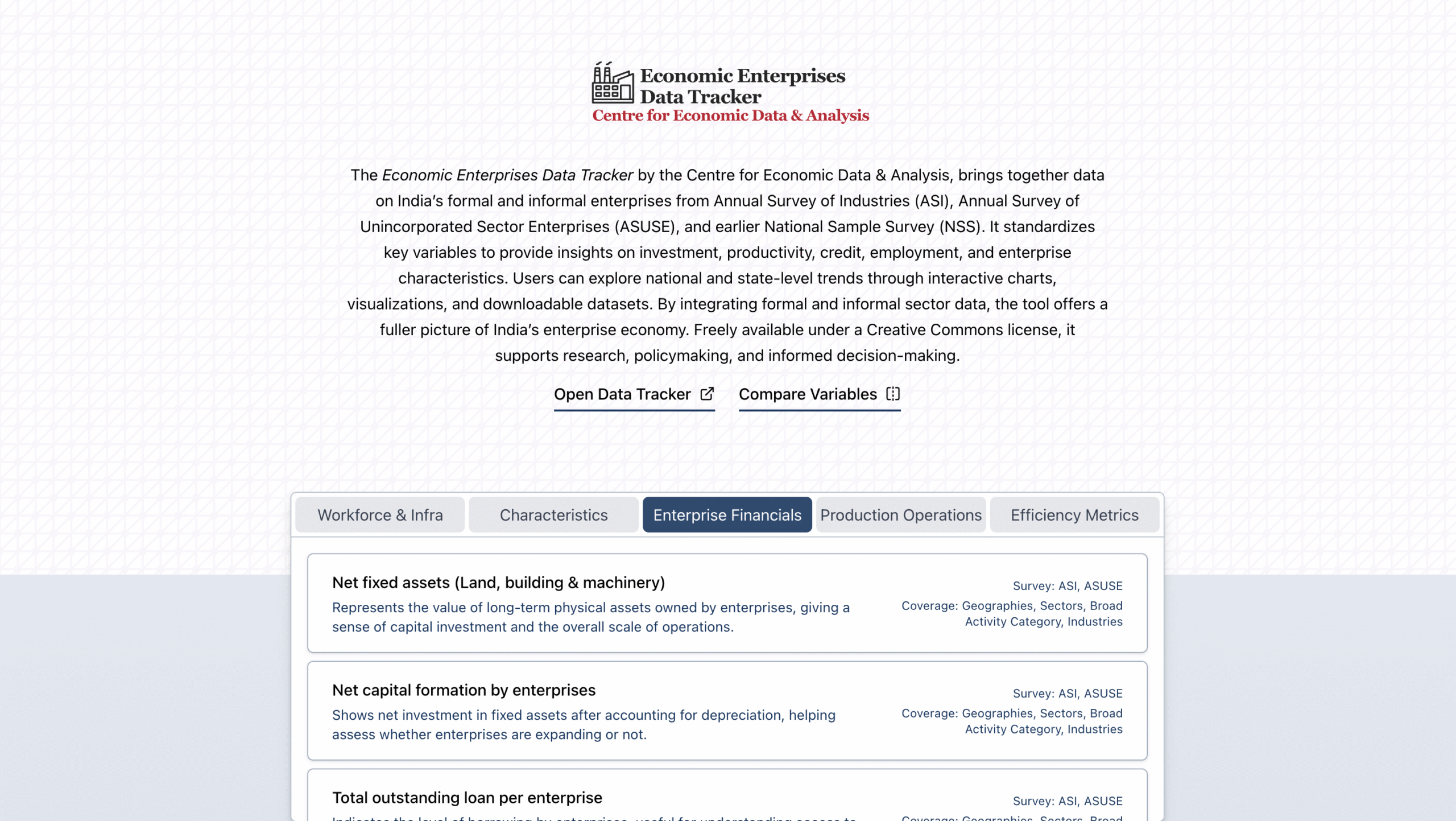 The Economic Enterprises Data Tracker by the Centre for Economic Data & Analysis, brings together data on India’s formal and informal enterprises from Annual Survey of Industries (ASI), Annual Survey of Unincorporated Sector Enterprises (ASUSE), and earlier National Sample Survey (NSS).
