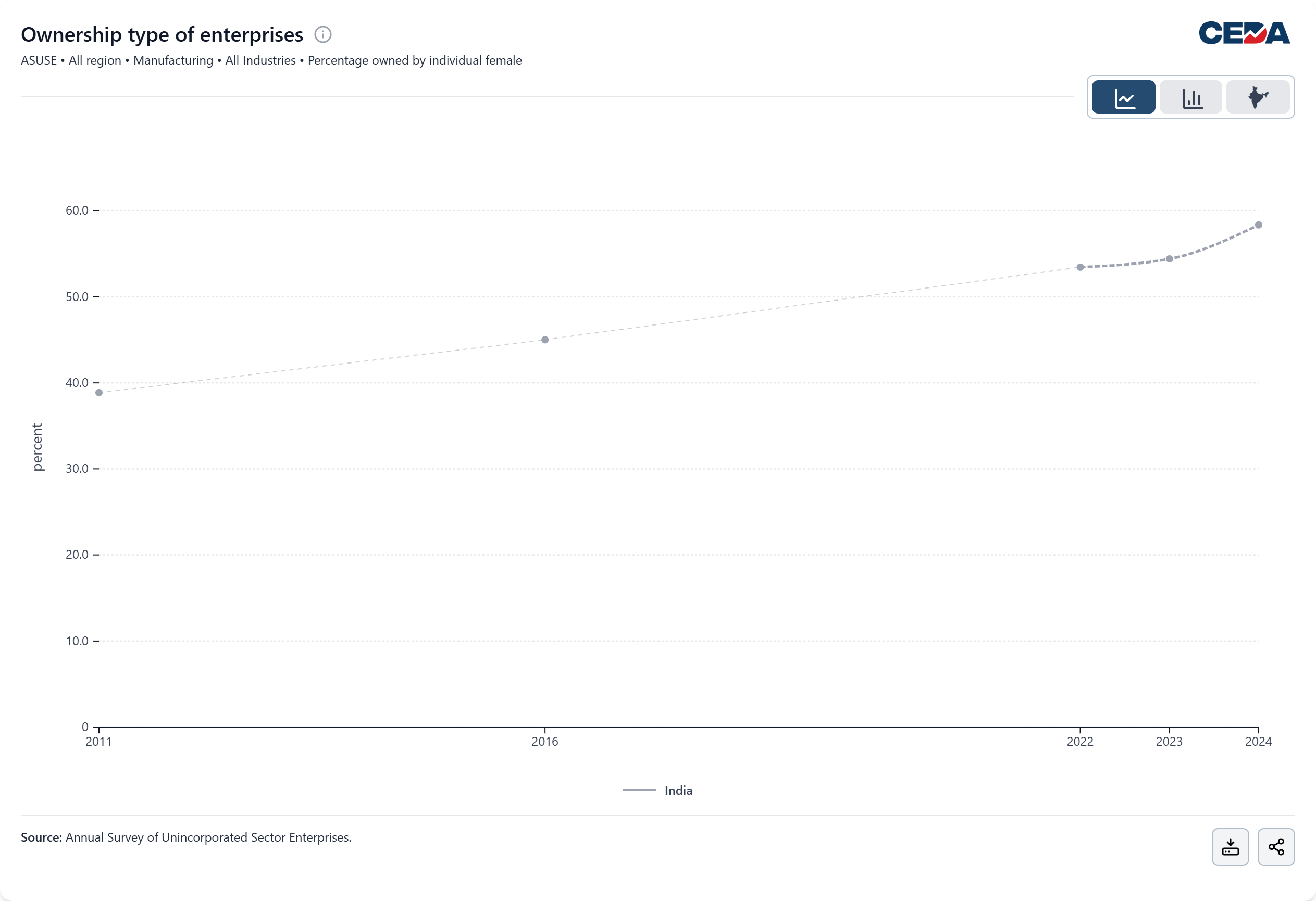 - By 2022, women accounted for the majority of ownership in informal sector manufacturing enterprises, with their share crossing the 50 percent mark.