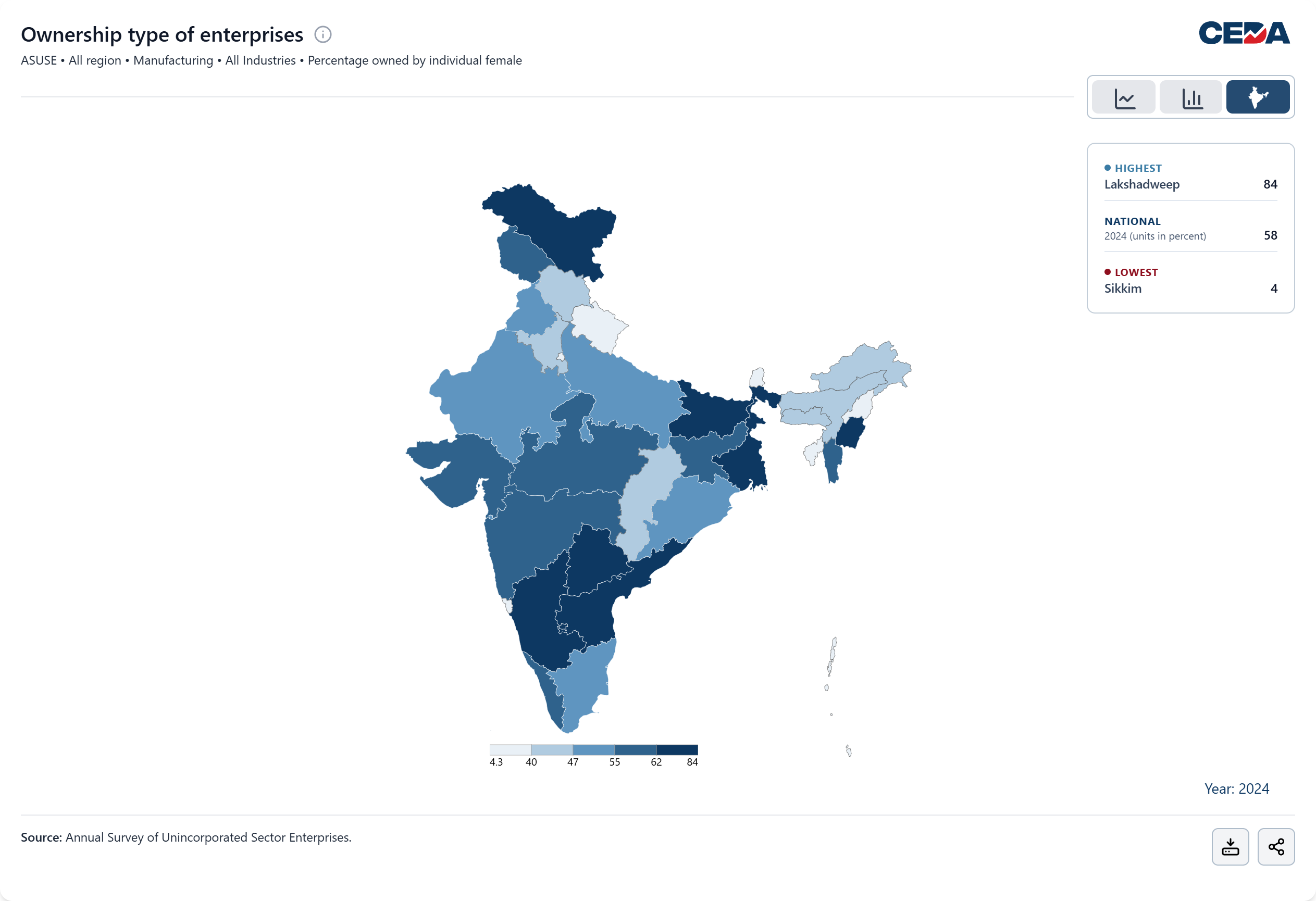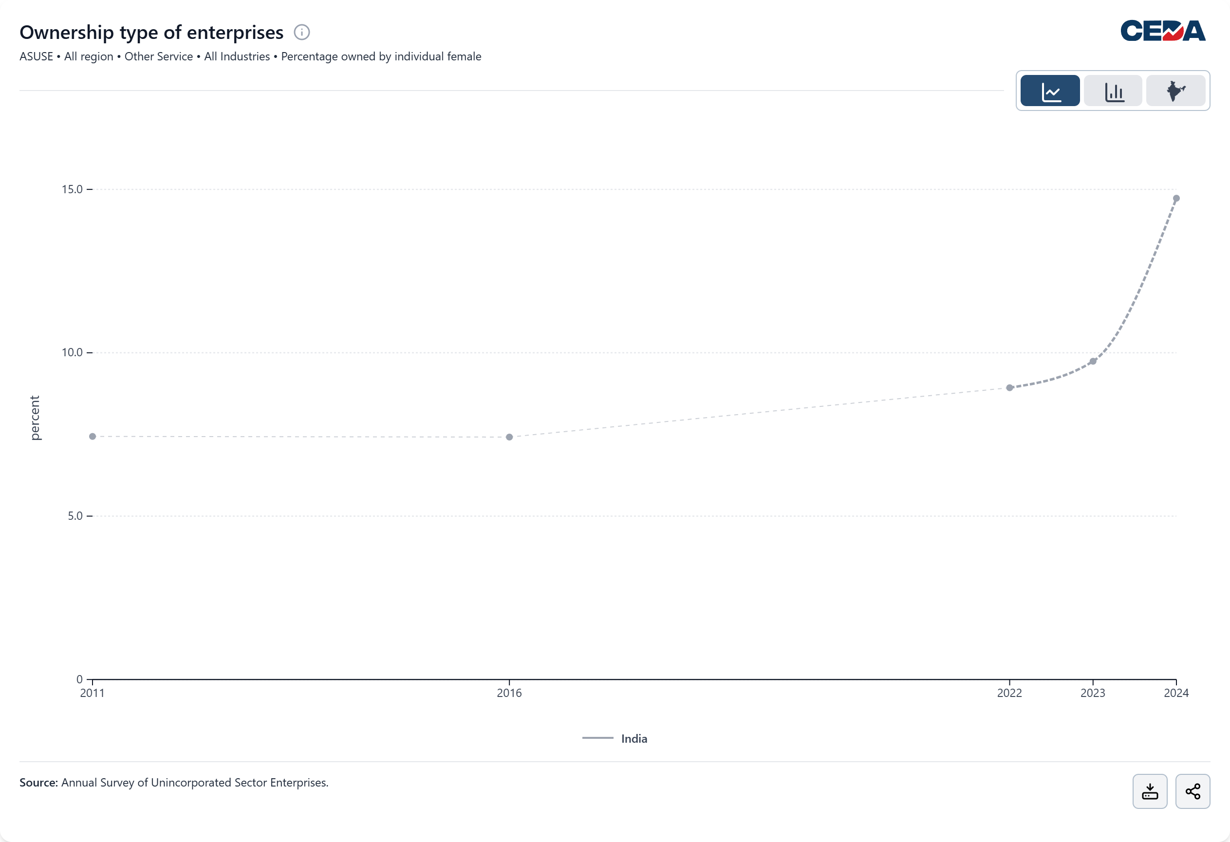 When we think of women entrepreneurs, we tend to picture the visible few: founders in formal offices, building startups and scaling businesses. But most women who own enterprises in India are not in boardrooms. They are running tailoring units, small manufacturing setups, retail shops, and local services- often from homes or neighbourhood spaces, largely outside the formal spotlight. While less prominent in mainstream narratives, this segment plays a significant role in shaping women’s ownership in India. This is the landscape captured by data on unincorporated non-agricultural enterprises, drawn from the National Sample Survey (NSS) 67th round (2010-11), 73rd round (2015-16) and the Annual Survey of Unincorporated Sector Enterprises (ASUSE). Visualised through CEDA’s Economic Enterprise Tracker, the analysis foregrounds the broader base of women-owned enterprises.